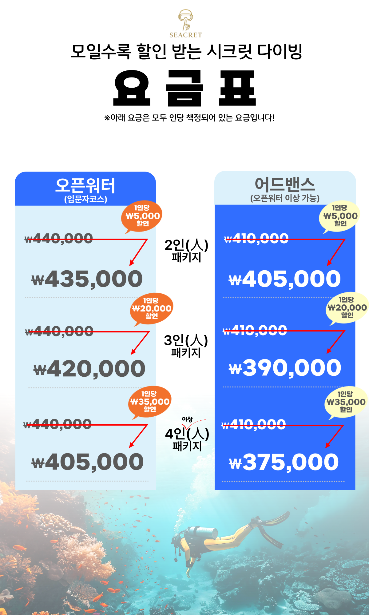 ※사전예약시 1인 -$5 할인 적용! 단, 현장추가시 할인적용 불가(모두 1인 기준 요금)
